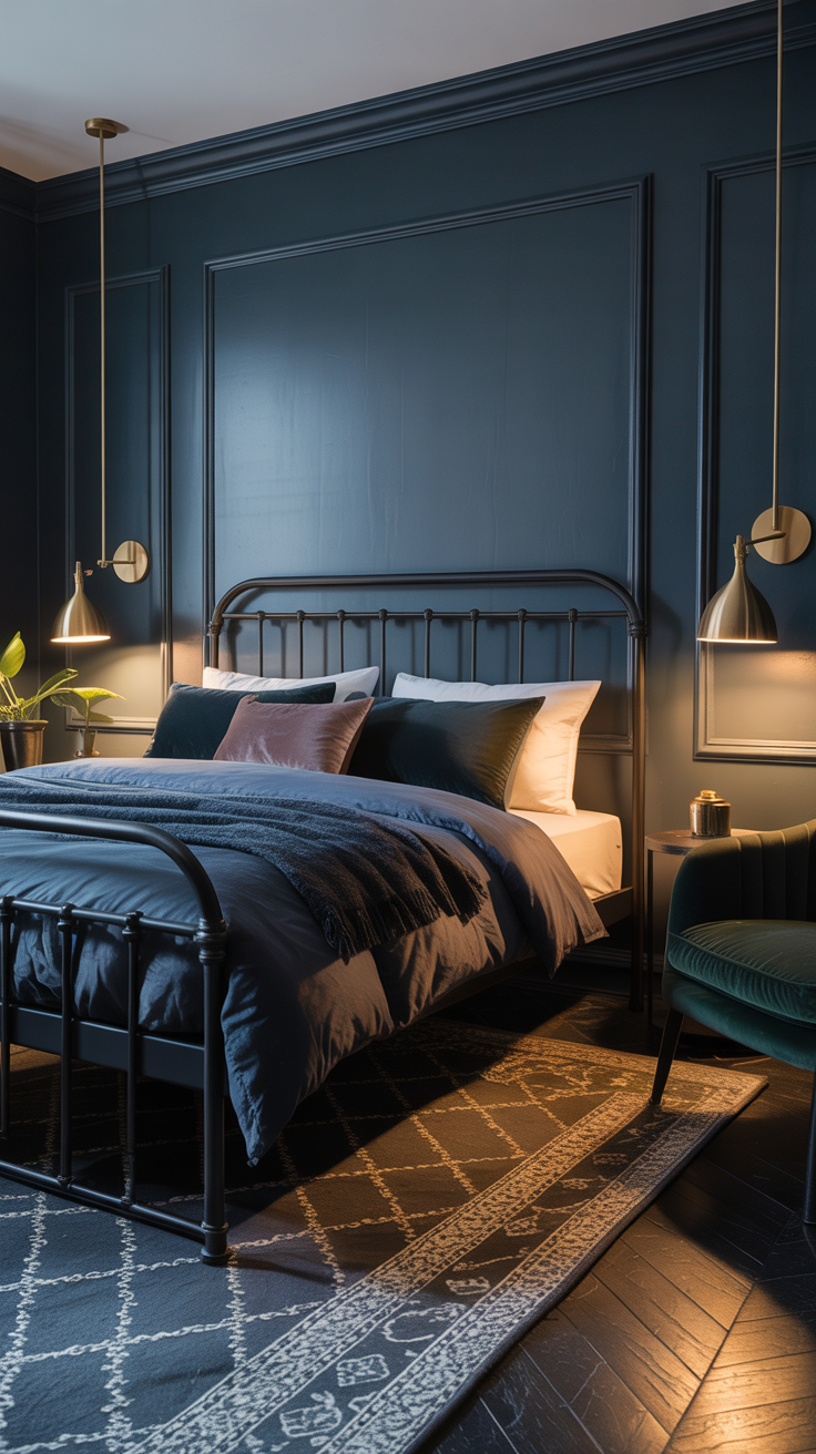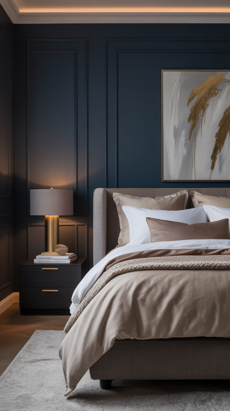 - Walls: Navy accent wall behind the bed