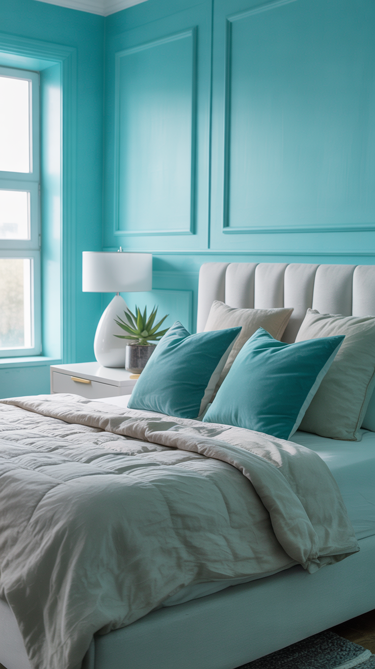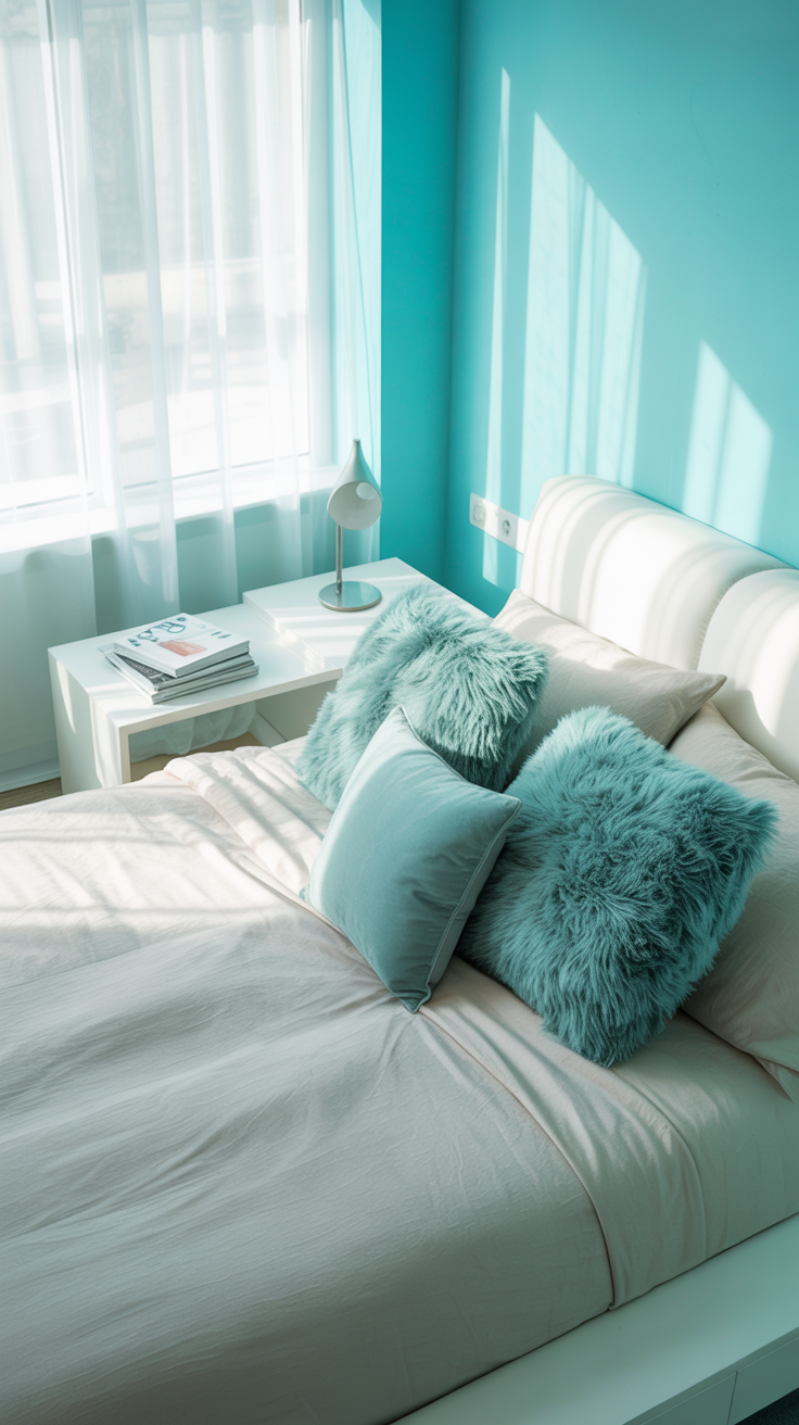 - Textiles: Neutral bedding with turquoise pillows