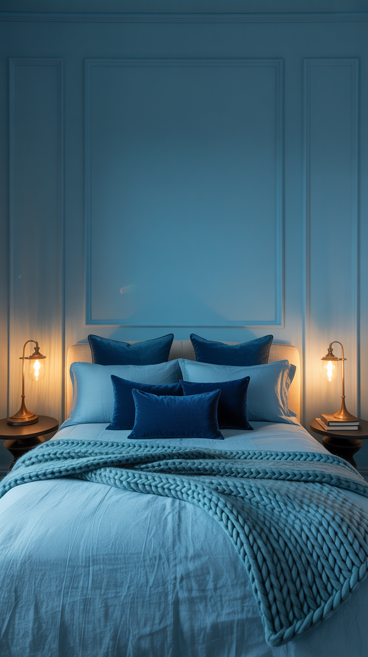 - Bedding: Multiple shades of blue layered
