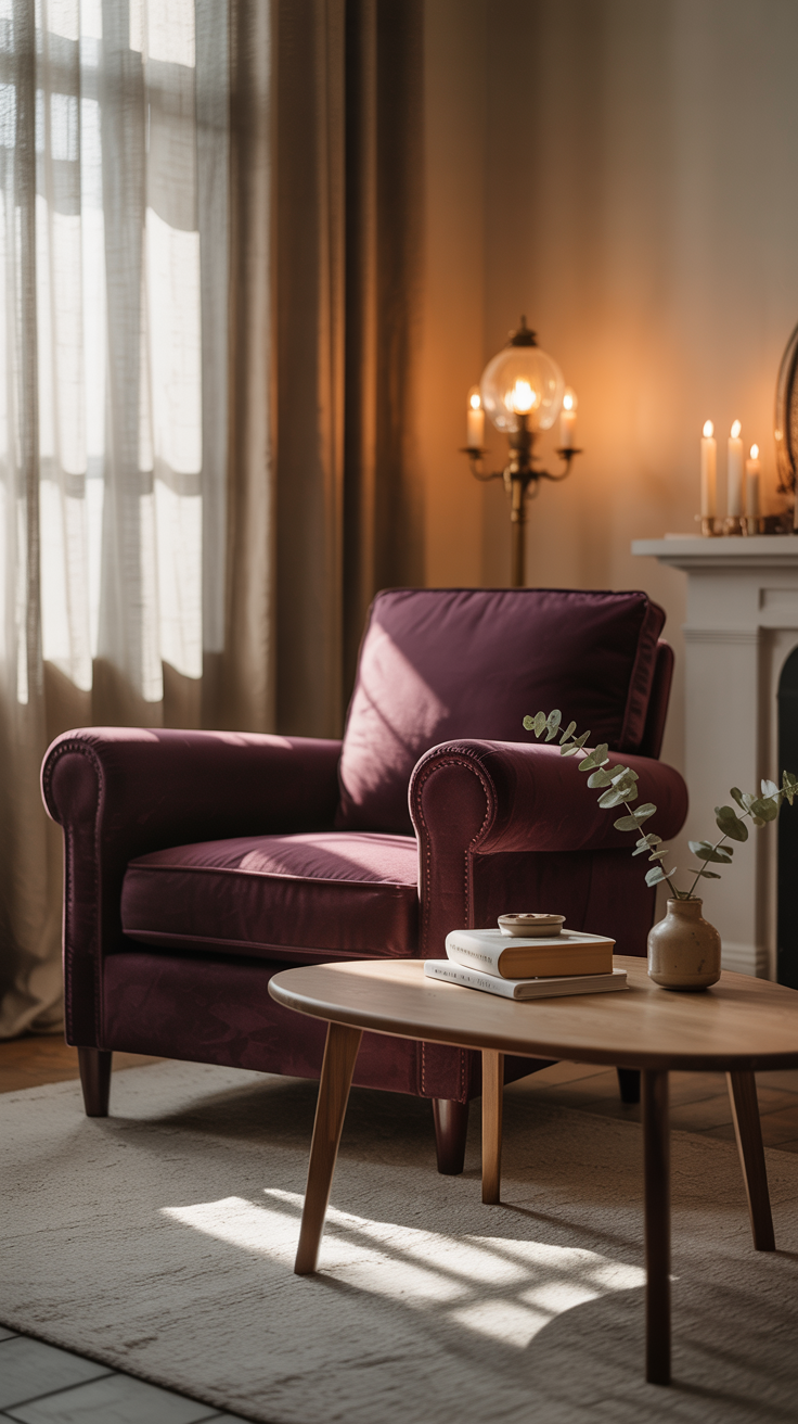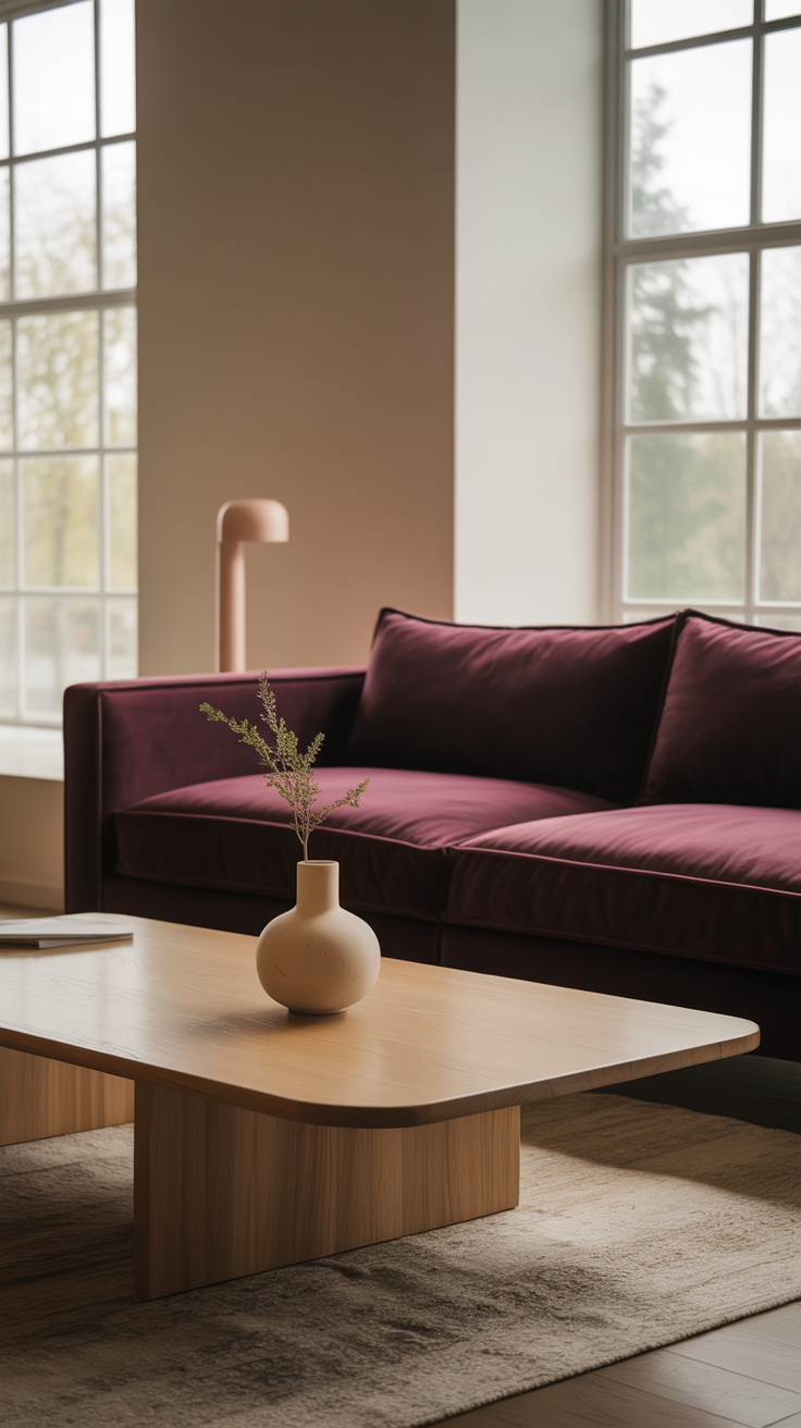 - Deep plum + warm wood = moody, cozy, yet sophisticated.
