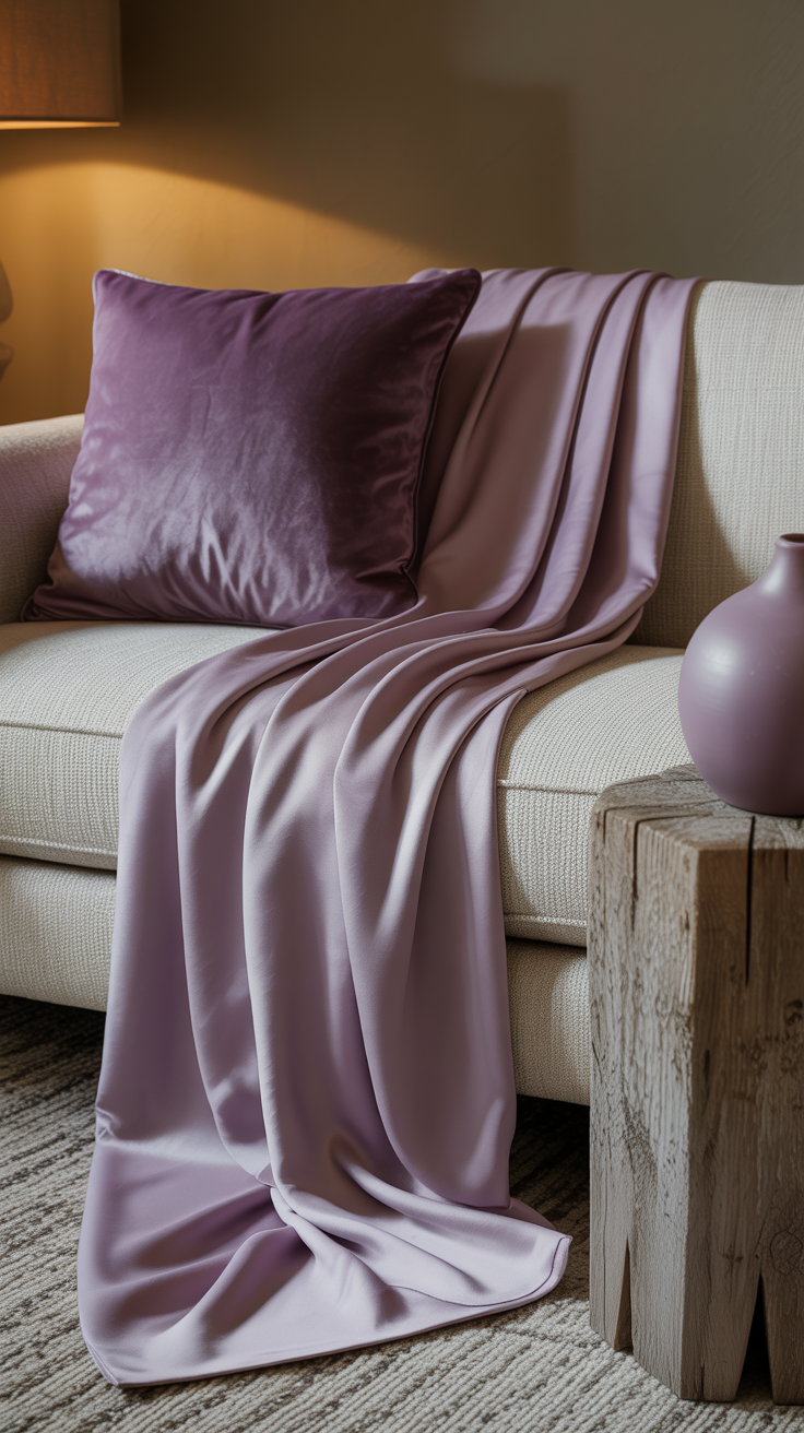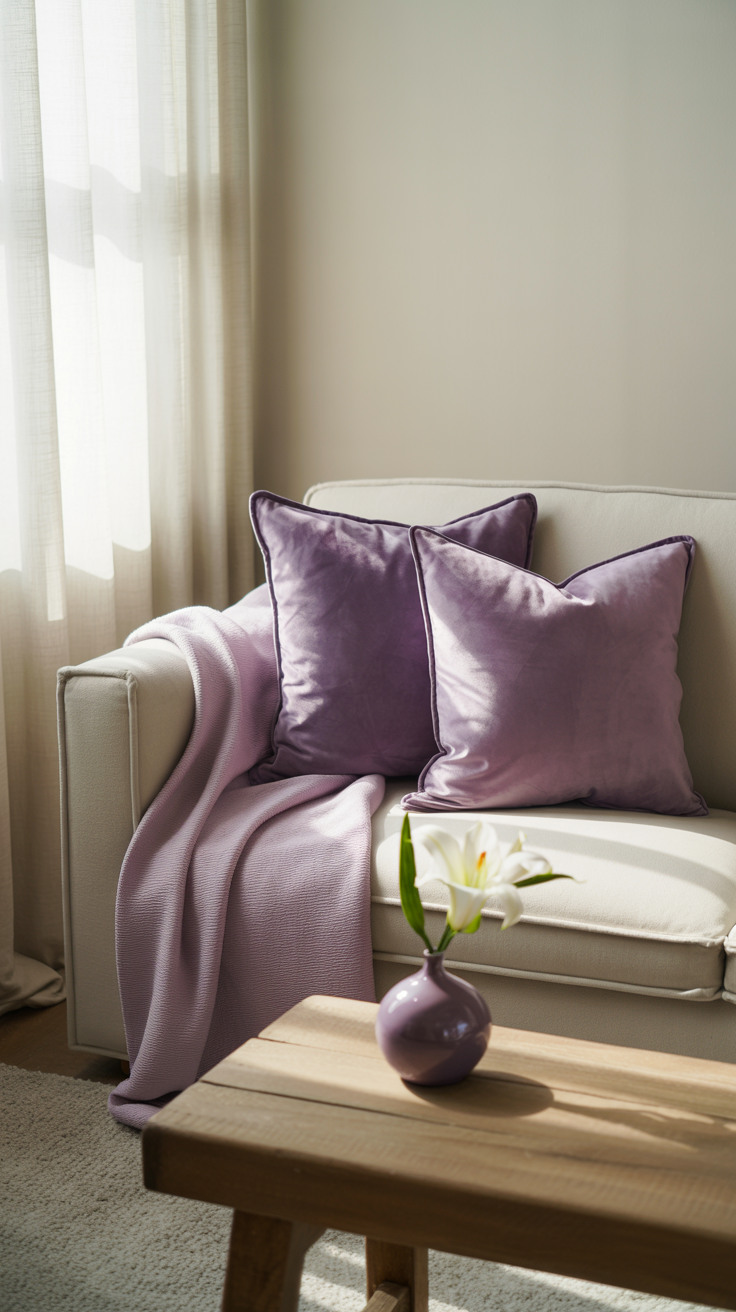 - Velvet purple pillows on a neutral sofa