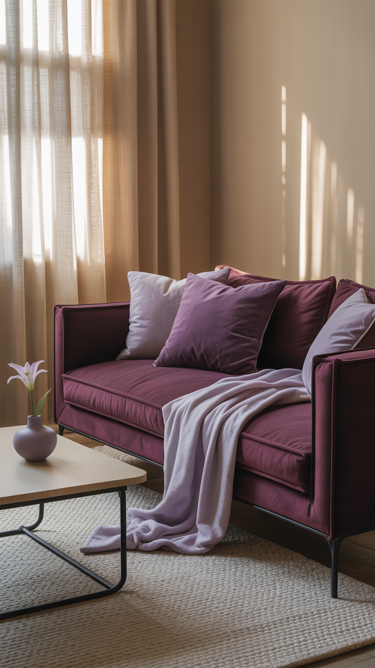 A purple sofa + neutral rug + minimal accessories = Instagram-worthy magic. Trust me.