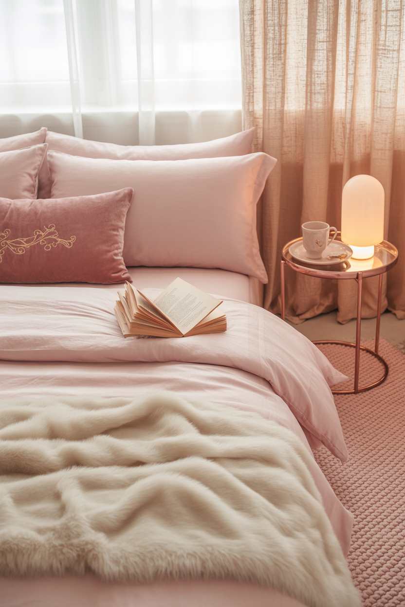 - Faux Fur – A blush faux fur rug or throw blanket = instant cozy glam.