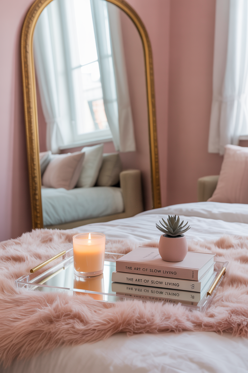 Pop a wooden or acrylic tray on your bed with a candle, a fake plant, maybe a book you’ll never read — it’s the laziest way to say “I styled this” without doing anything.