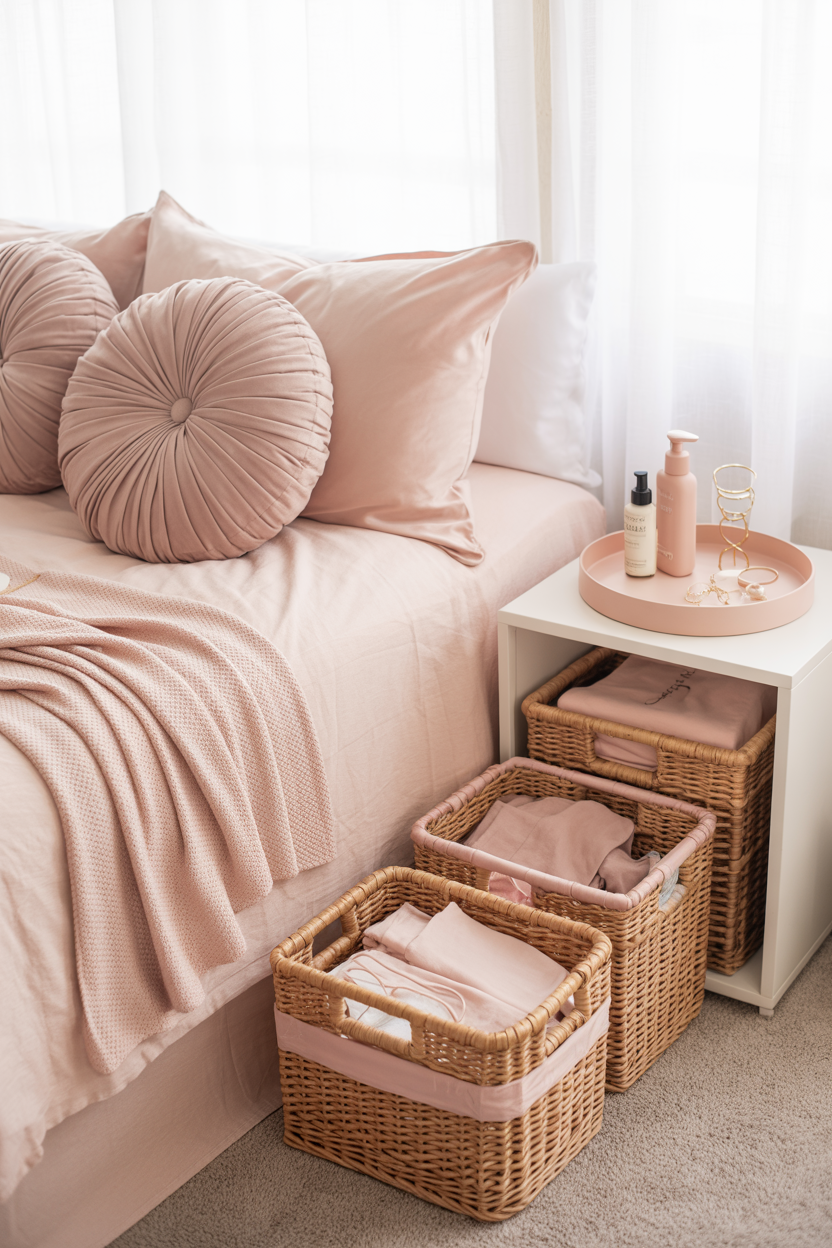 Get a few aesthetic baskets or bins (think blush, woven, or linen-covered), toss in your chaos, and boom — you’re tidy now.