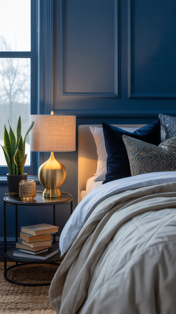 Example: Navy walls + crisp white bedding + gold lamp = instant Pinterest magic.