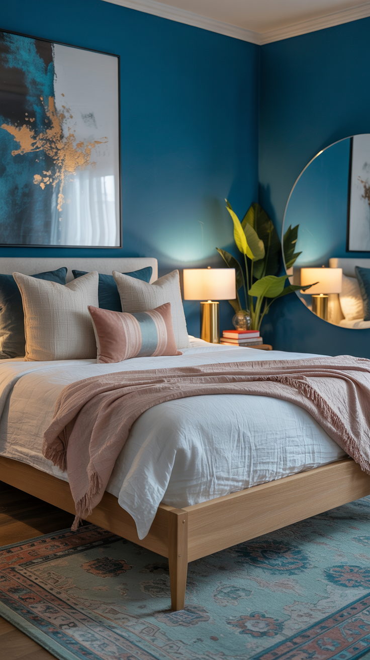 💡 Pro Tip: If you have a tiny bedroom and choose navy, make sure you’ve got white or light accents, or you’ll end up feeling like you’re trapped inside a blueberry.