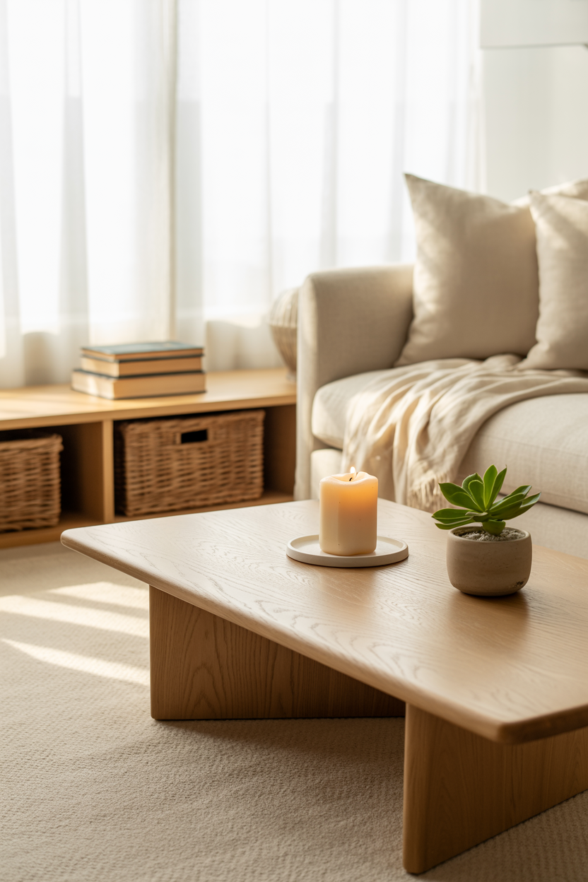 - Keep surfaces clear. That coffee table? Only keep essentials like a candle, a small plant, or a book you’re reading. Everything else goes into drawers or baskets.