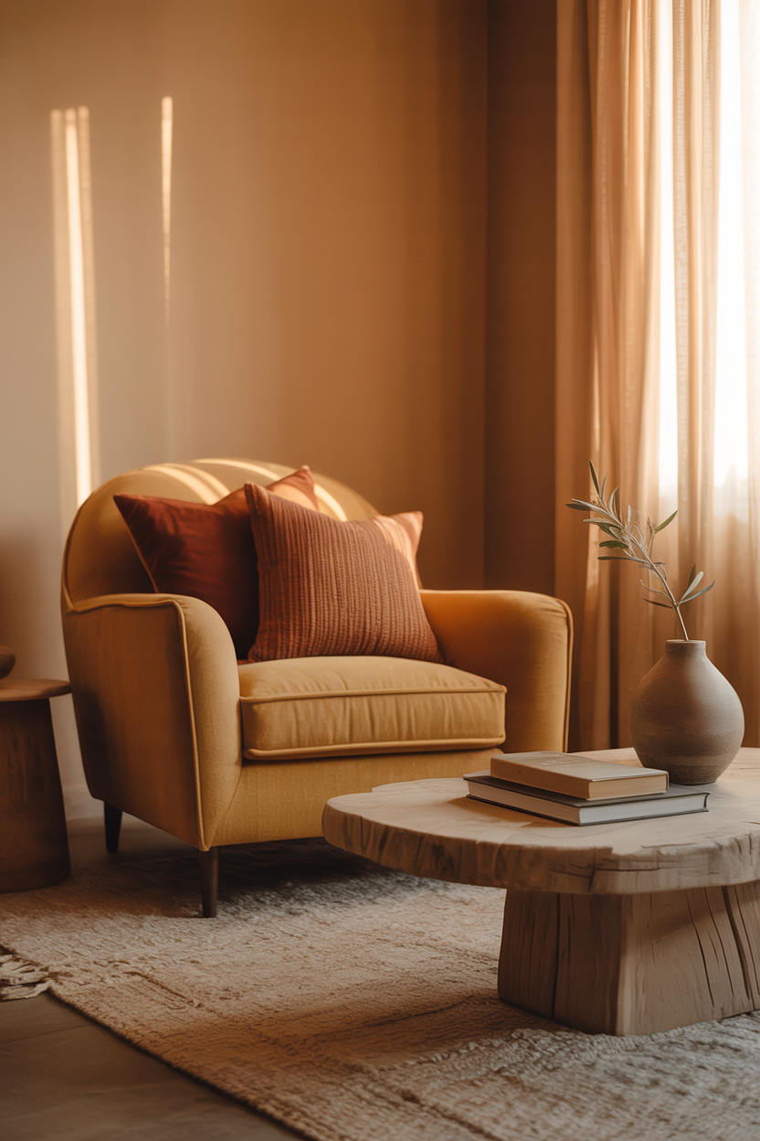 - Earth tones: Rusty oranges, deep greens, mustard yellows, chocolate browns. These colors make the space feel grounded and warm, like a hug from Mother Nature.