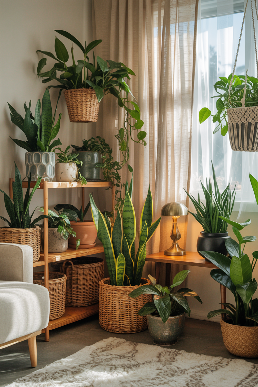 - Earthy pots (terra cotta, stone, neutral ceramics)