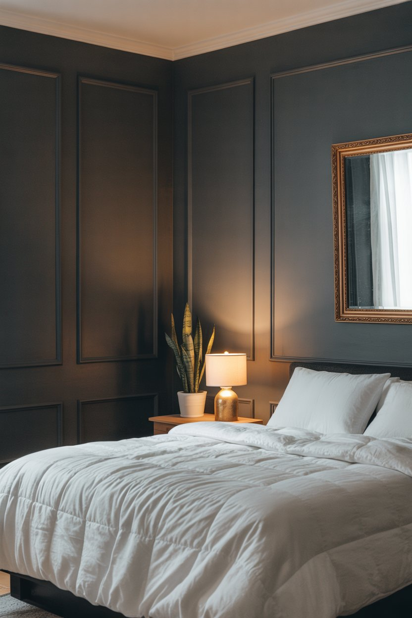Too much dark and suddenly your bedroom looks like a cave. No one wants to live in a cave. So, mix these dark walls with lighter accents: