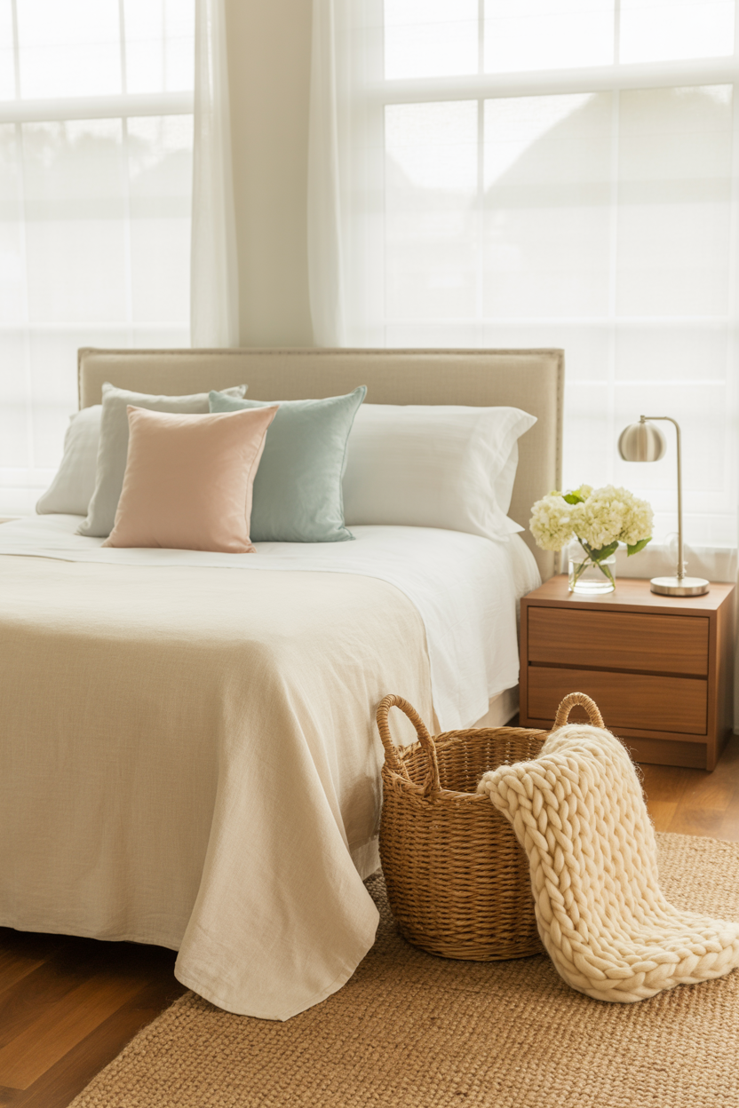 - Soft neutrals (white, beige, greige, soft gray) for a clean, calm vibe