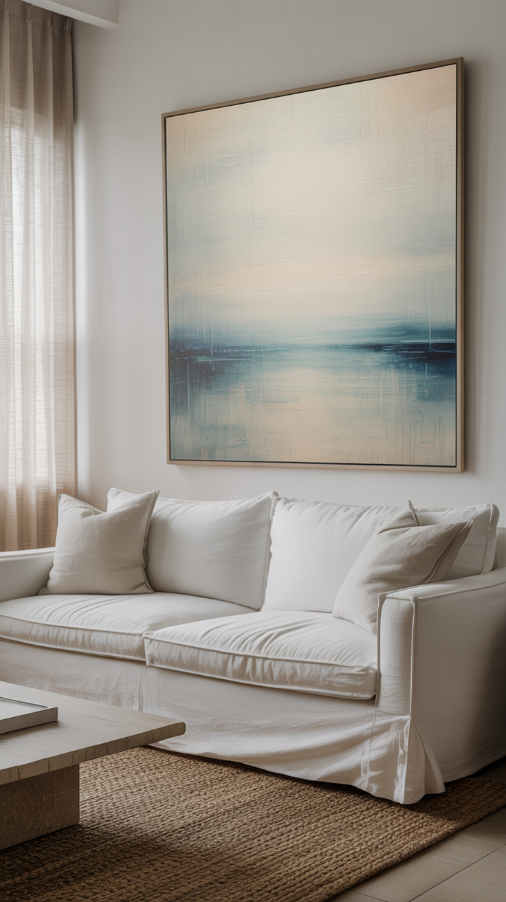 - Textured wall art—woven tapestries, driftwood installations, framed linen.