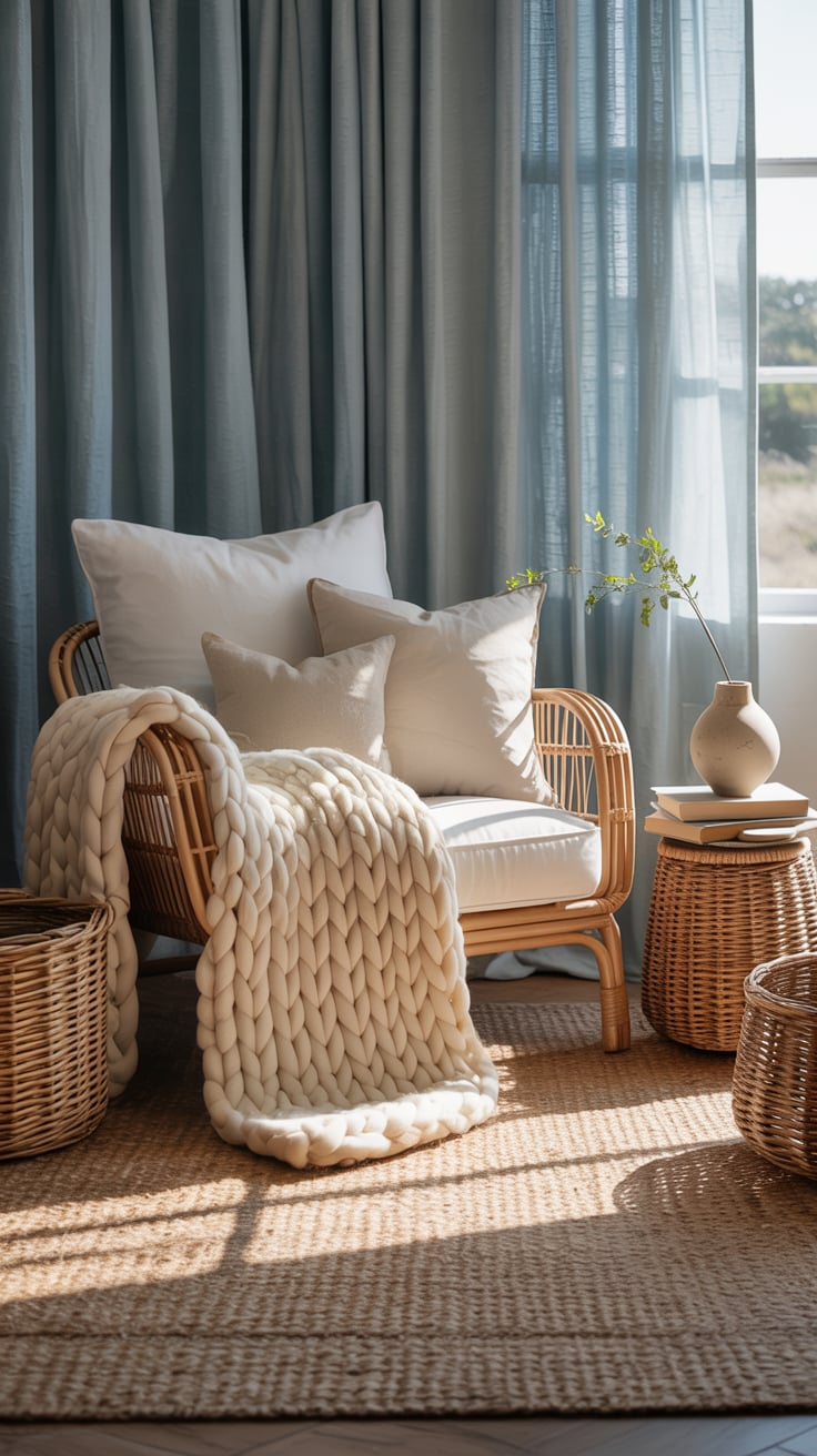 - Throw pillows in muted blues, creams, and textures.