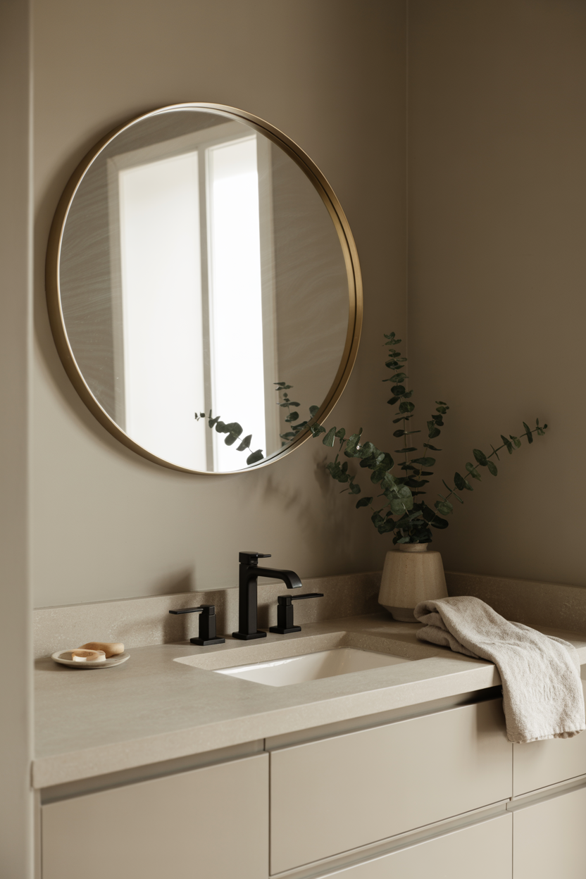 You can buy mirror frame kits online or DIY with trim and adhesive. Suddenly it looks intentional, not “oh yeah, the builder slapped it there.” - Go round.