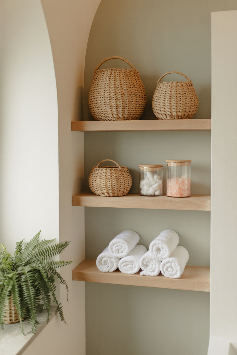 Floating shelves, ladder shelves, or wall hooks for towels make your bathroom feel like a curated spa instead of a cluttered closet. - Match your containers.